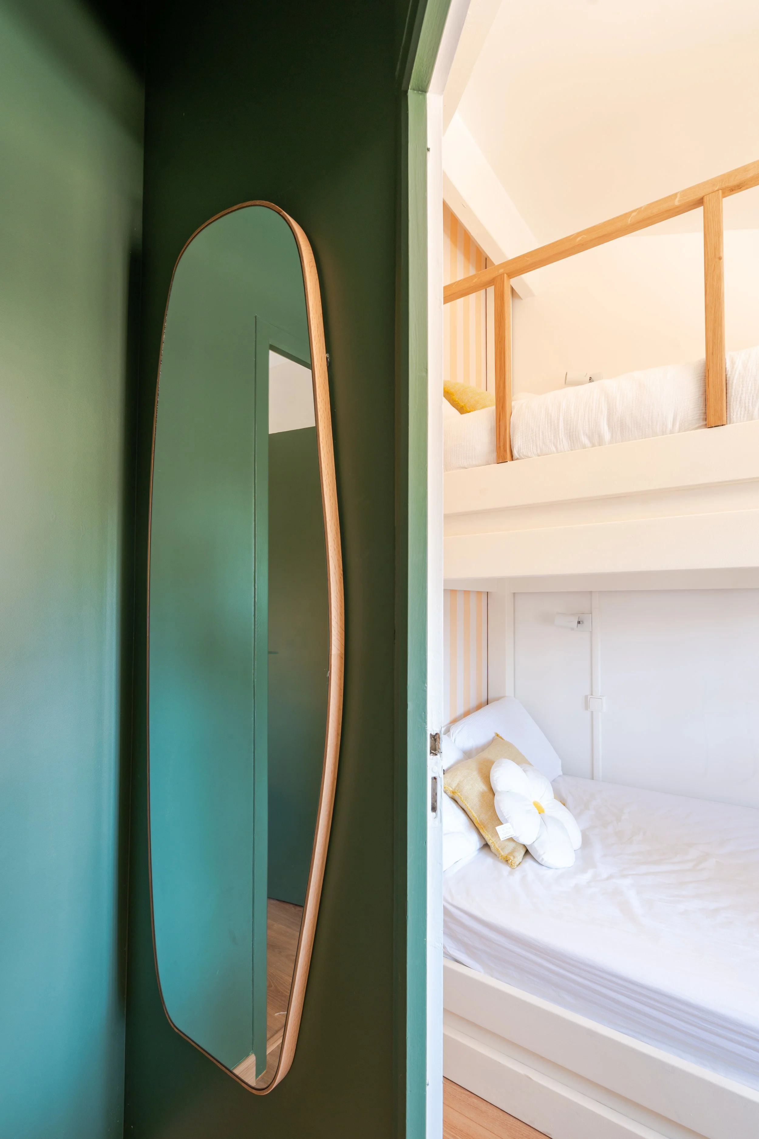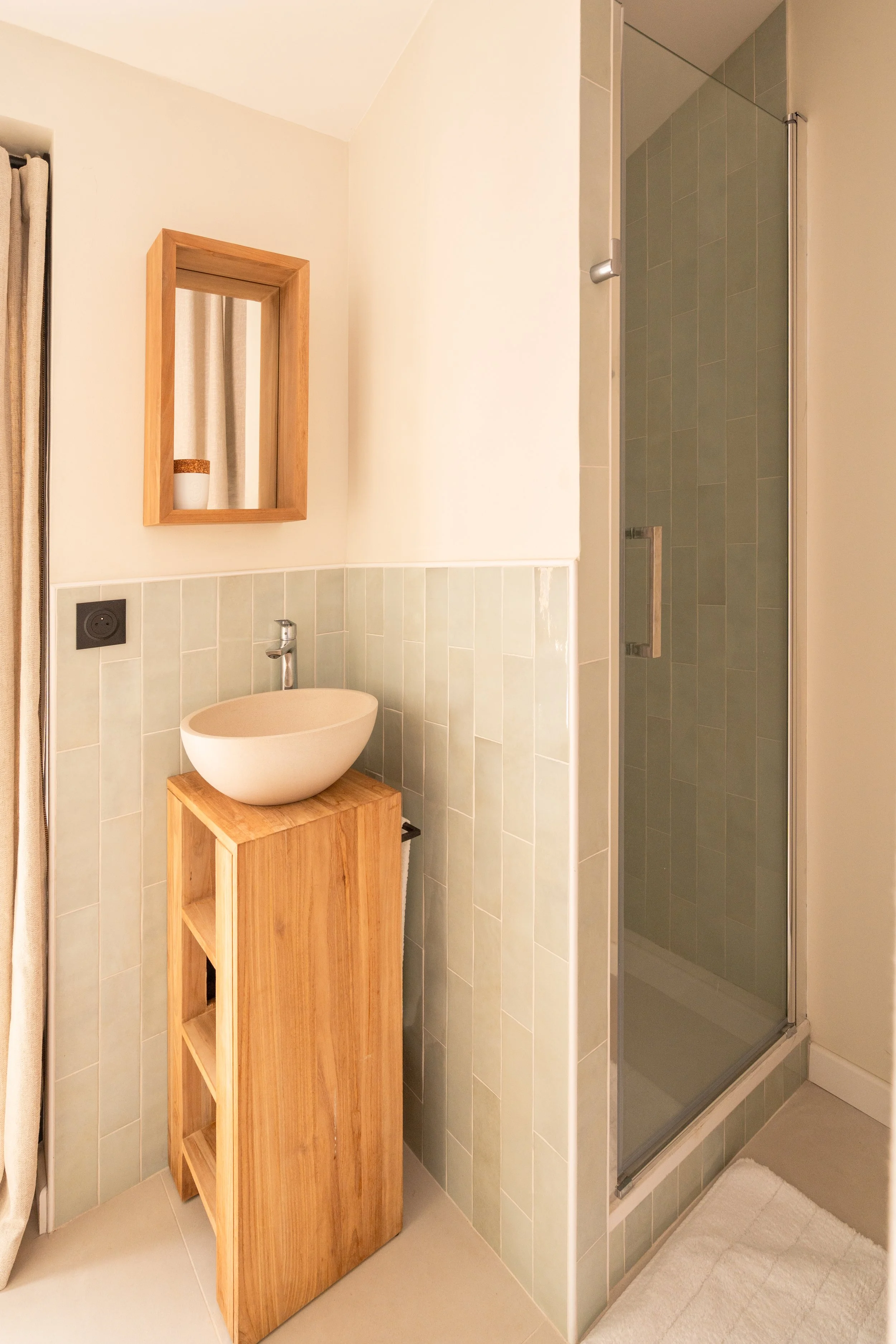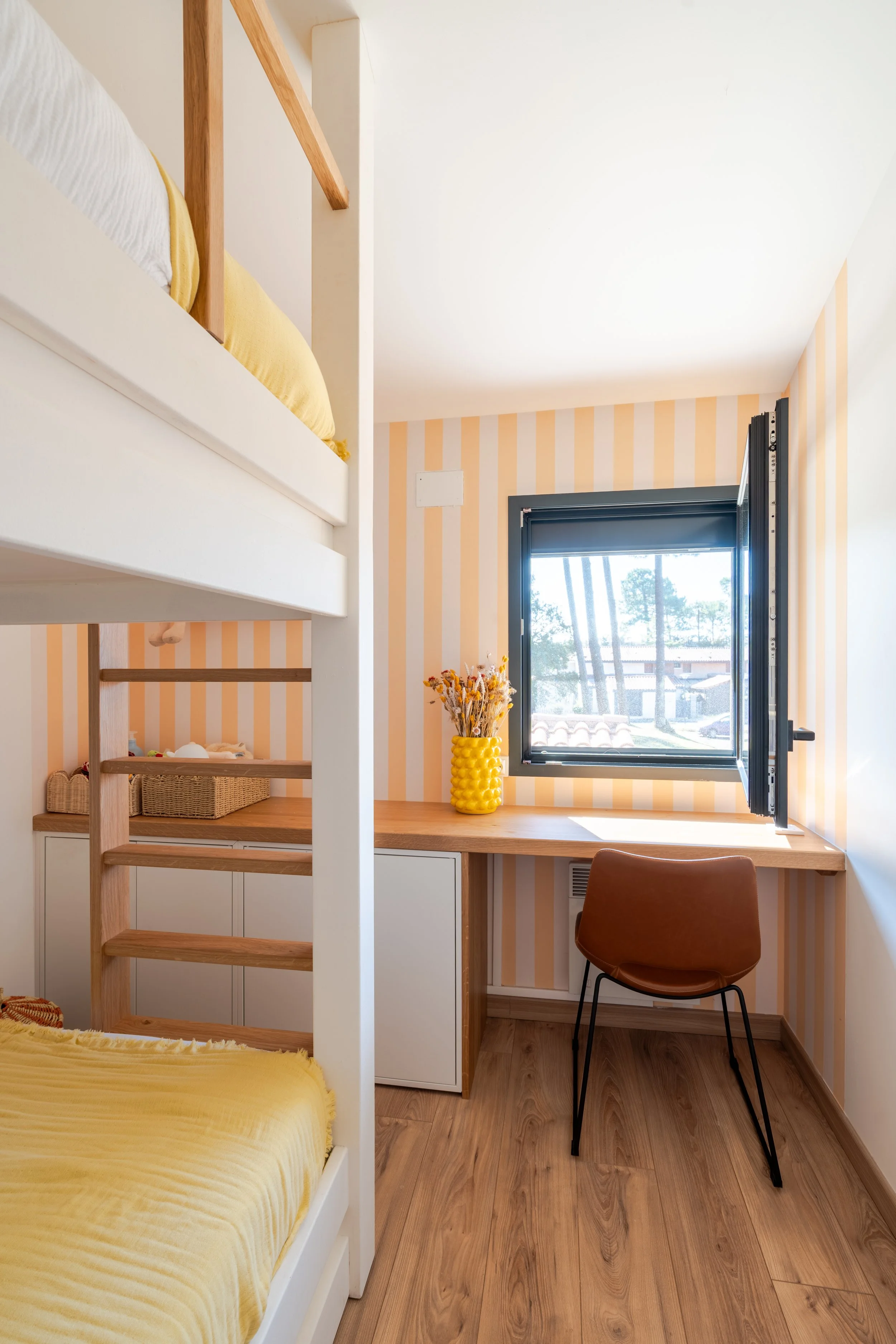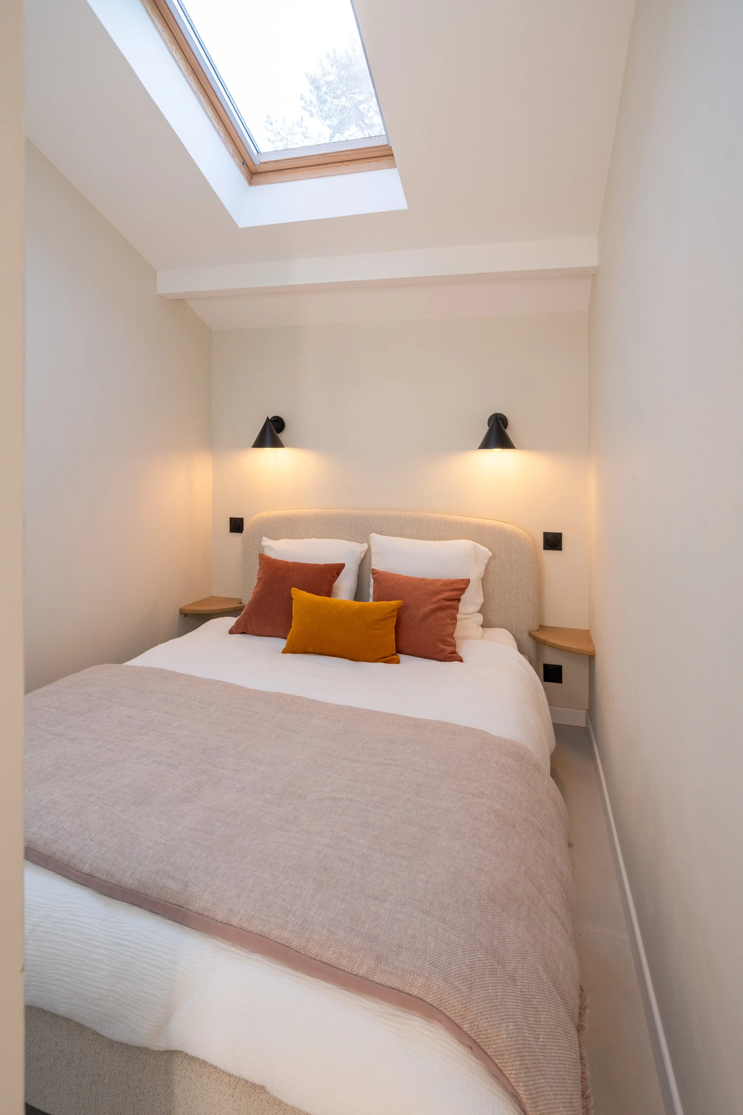 La maison de plain-pied, accueille quatre chambres dont une suite parentale. Comme une balade en forêt, elle offre son lot de surprise et de poésie, il en est ainsi de la petite salle de bain que l’on découvre derrière une porte dissimulée dans le dressing.