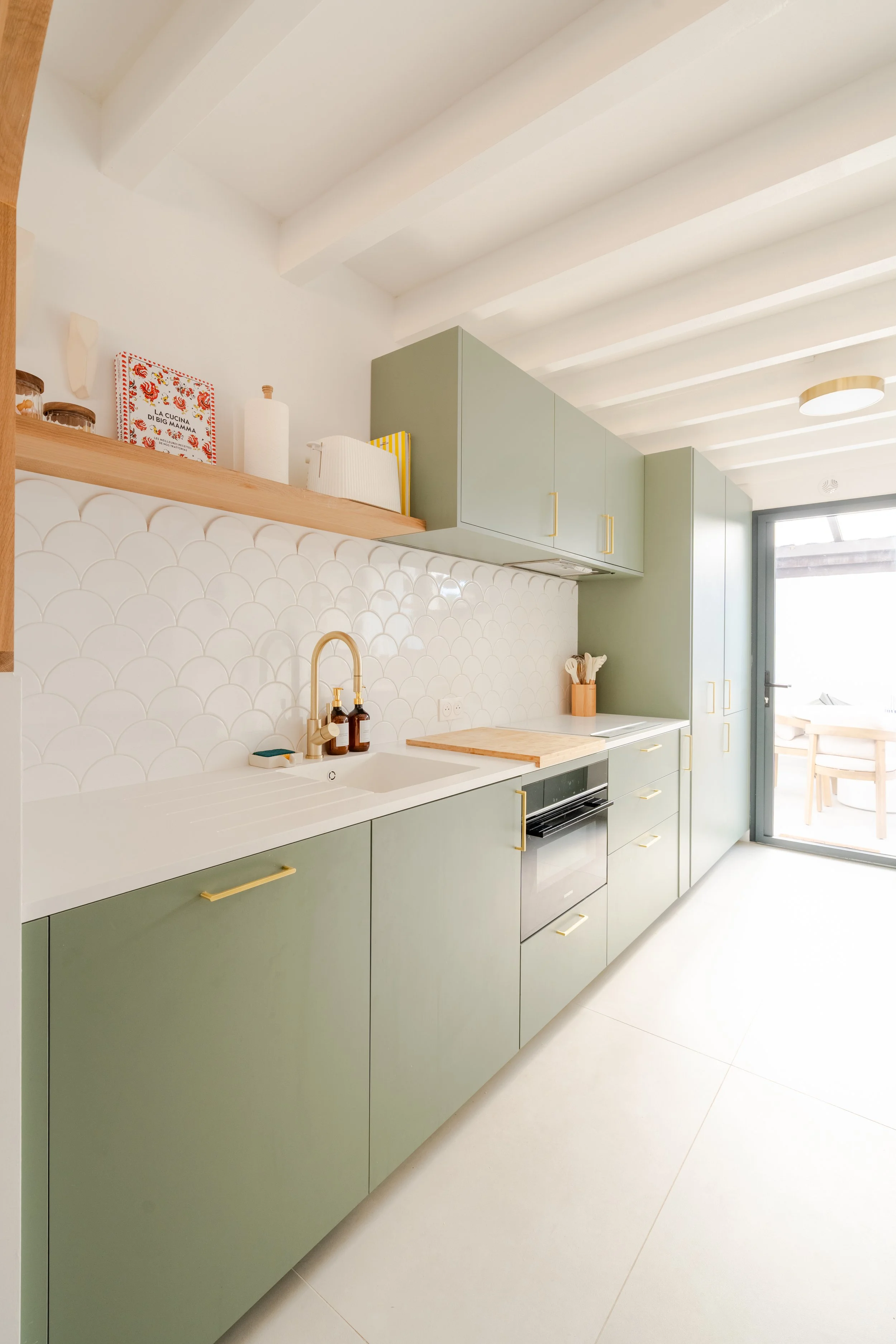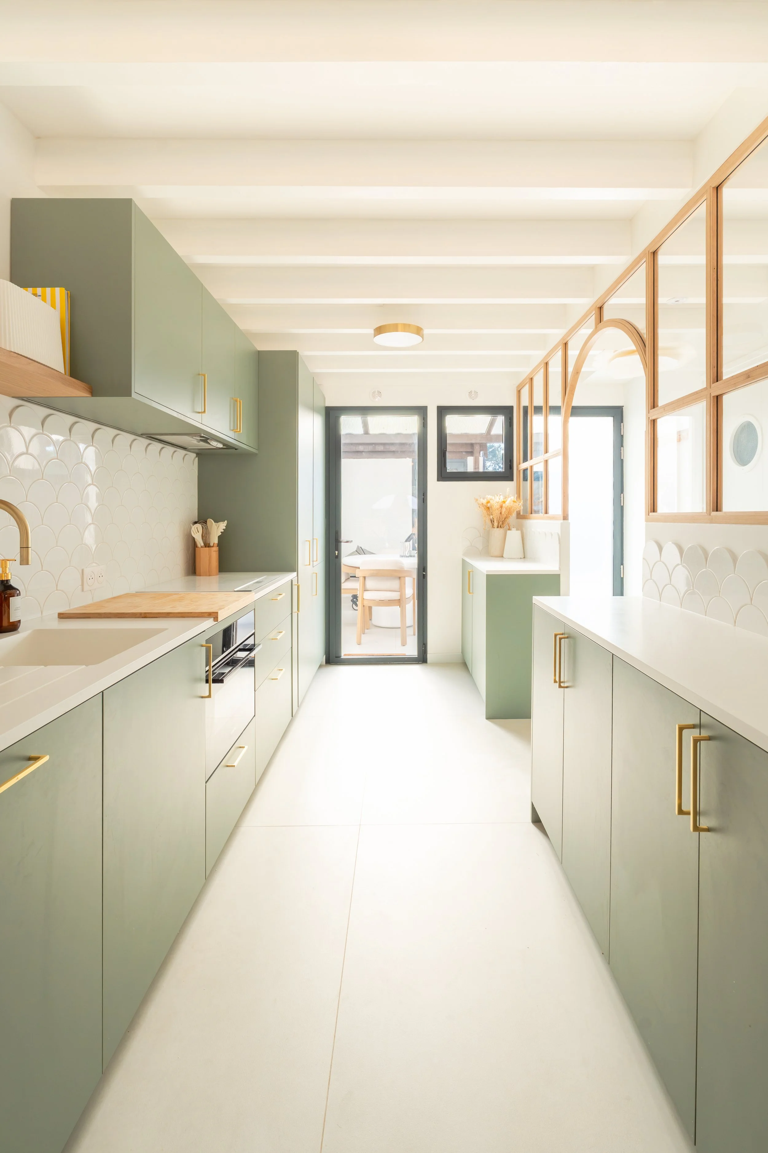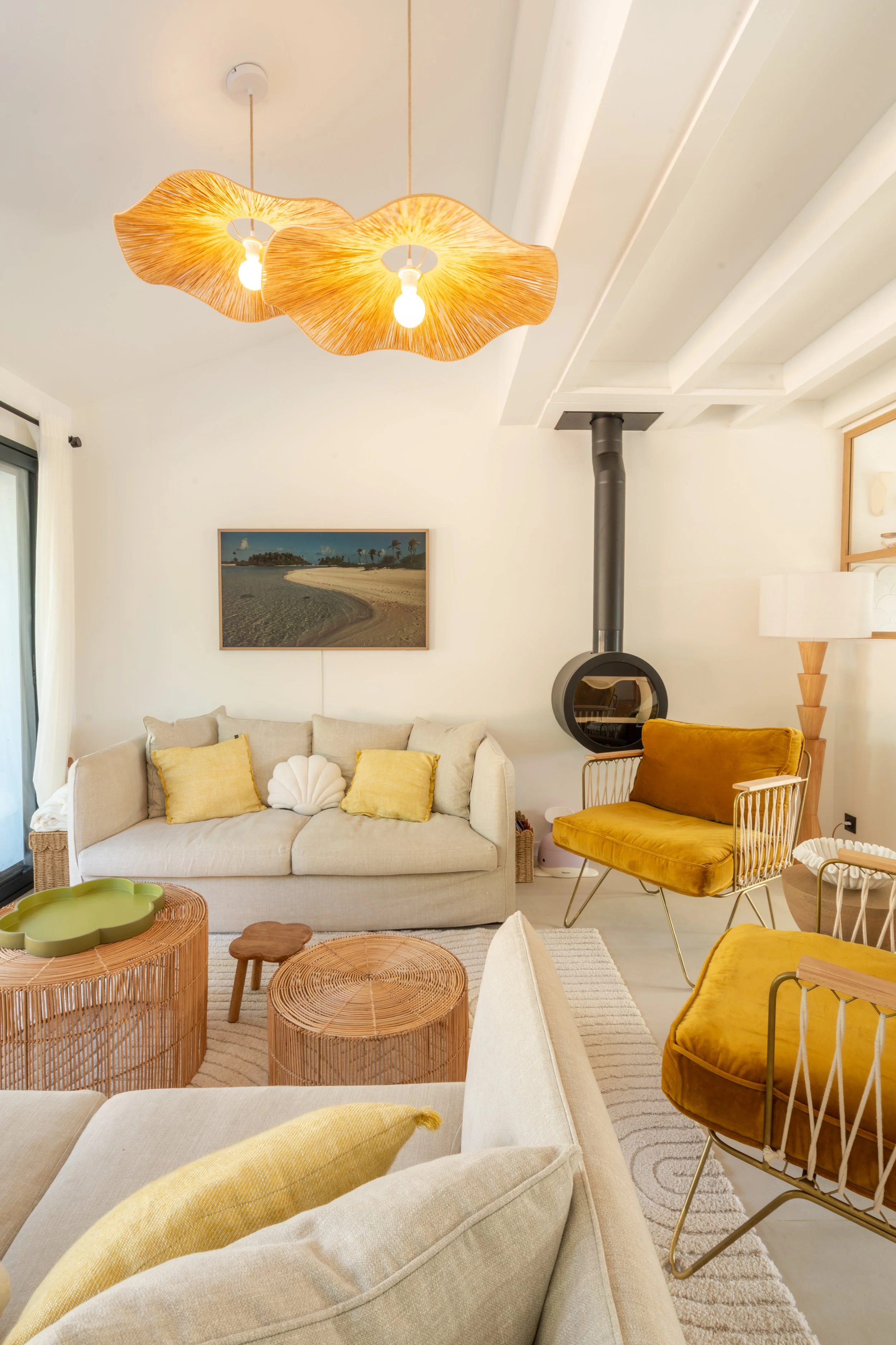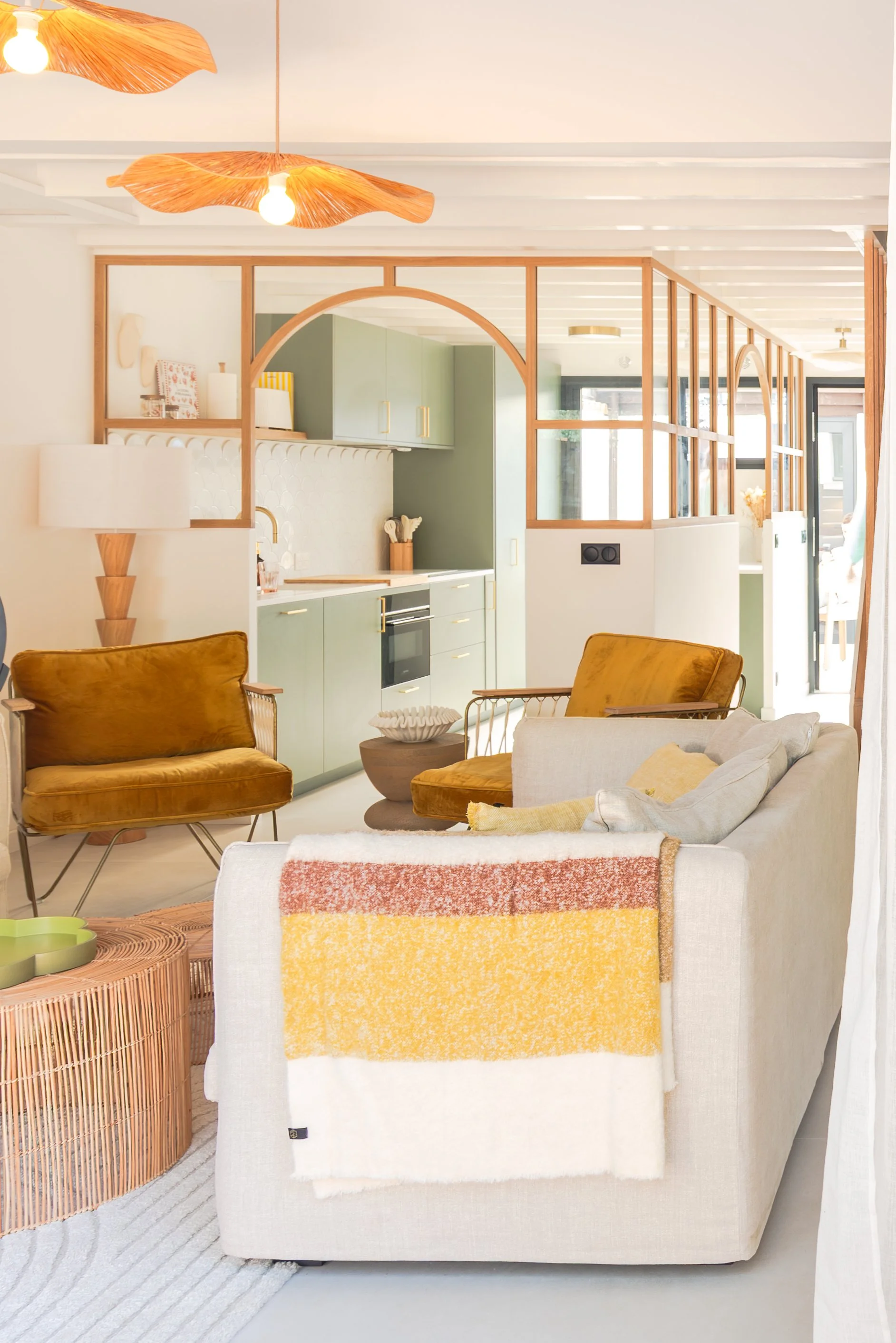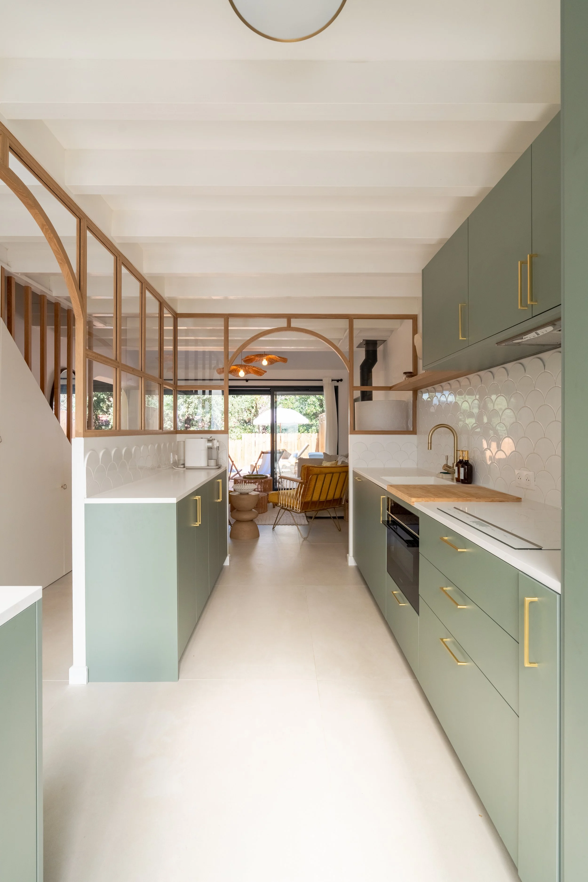 La cuisine de caractère et son îlot massif constituent le cœur battant du foyer. Depuis, une large baie vitrée offre une vue imprenable sur la terrasse et la piscine.