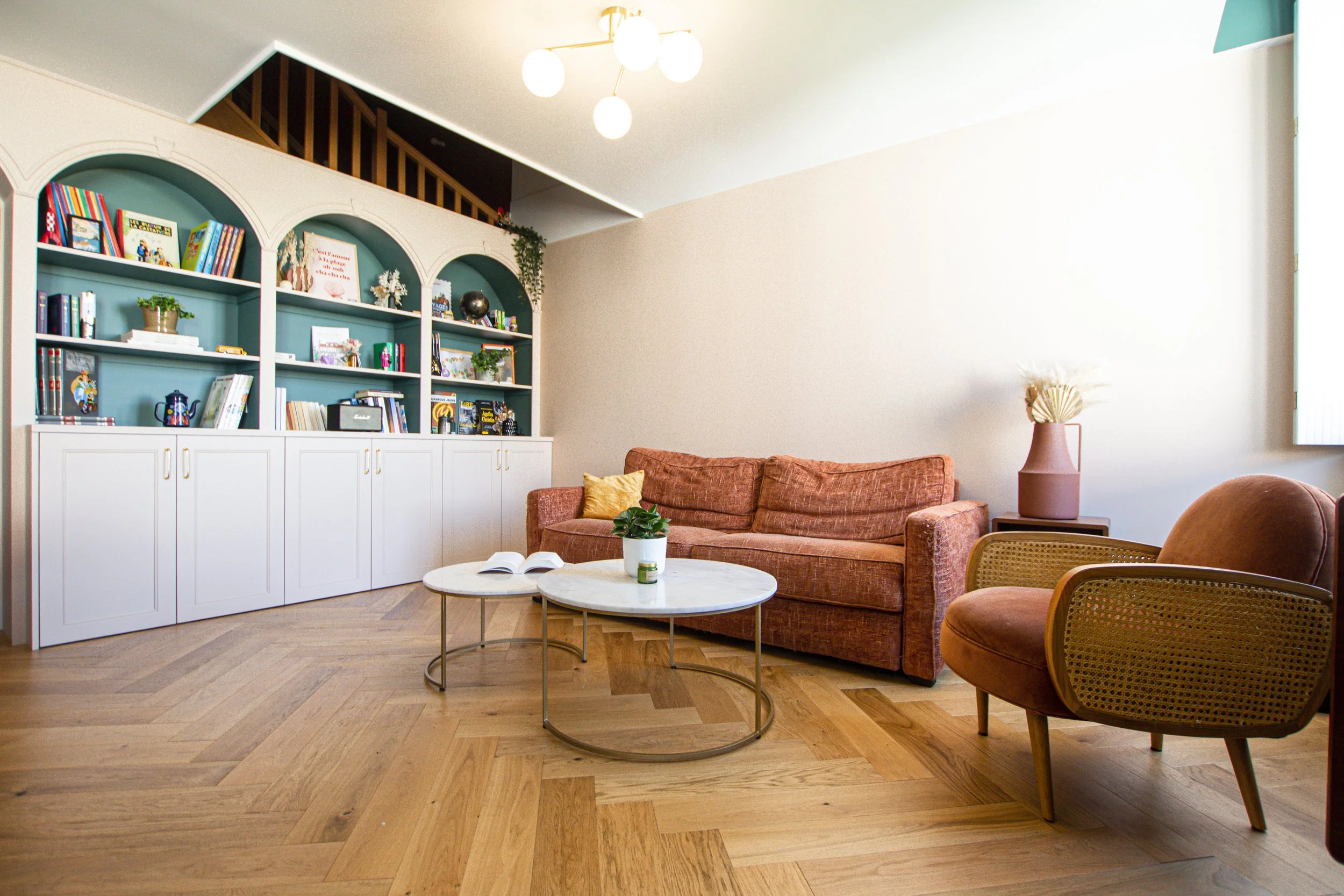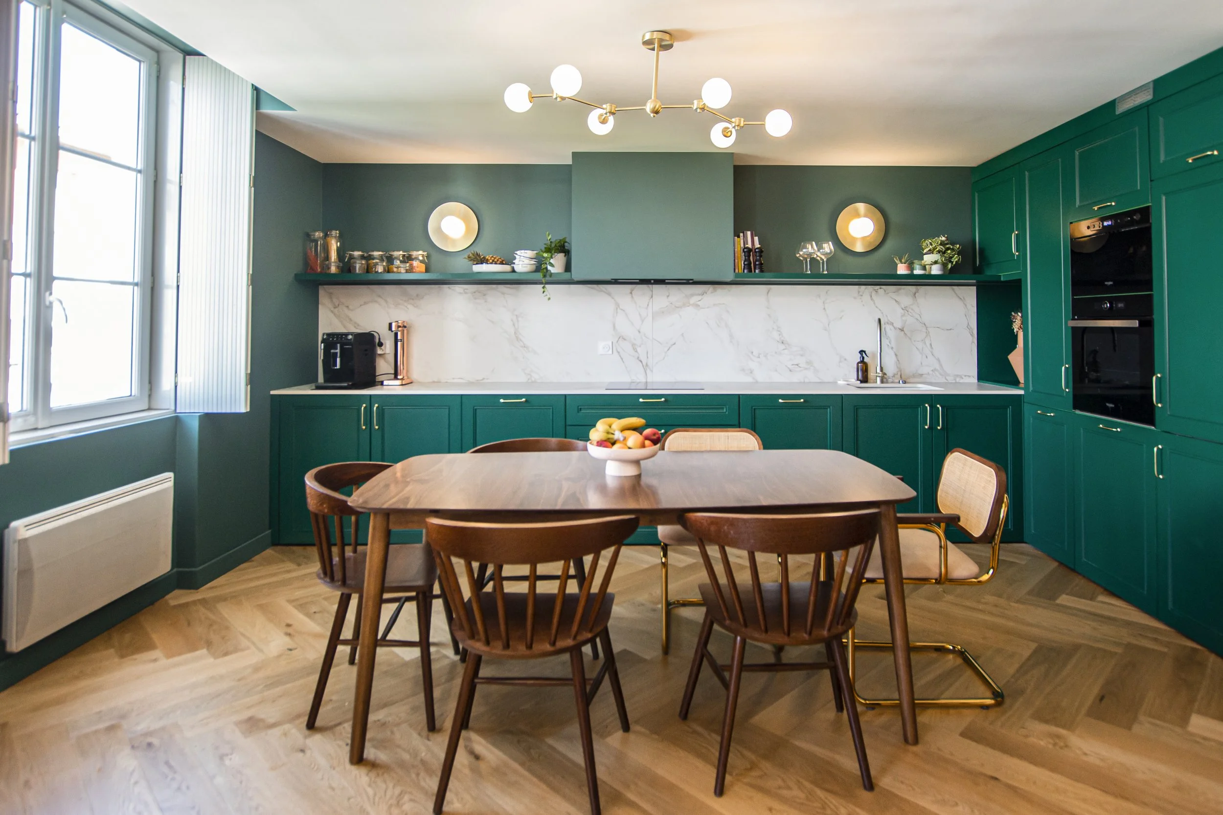 Côté fonctionnalité et rationalité, le long de la pièce de vie se déroule un meuble de cuisine qui devient meuble de télévision puis banquette… une hybridation qui n’a d’égale que l’accessoirisation résolument poétique de ce petit concentré d’émotions colorées.