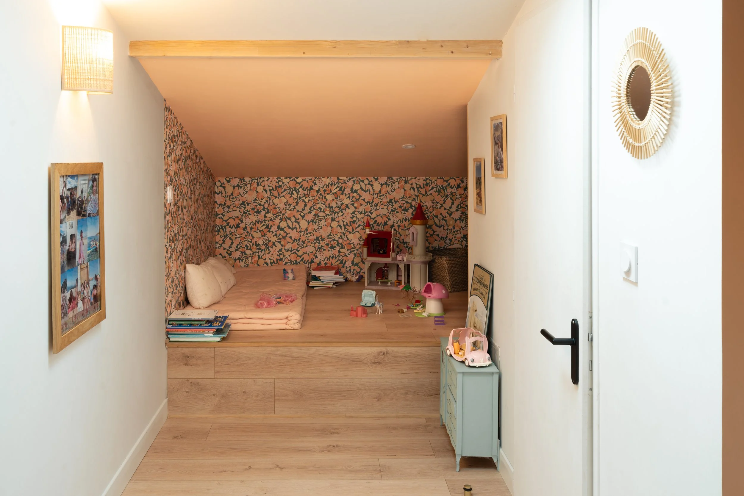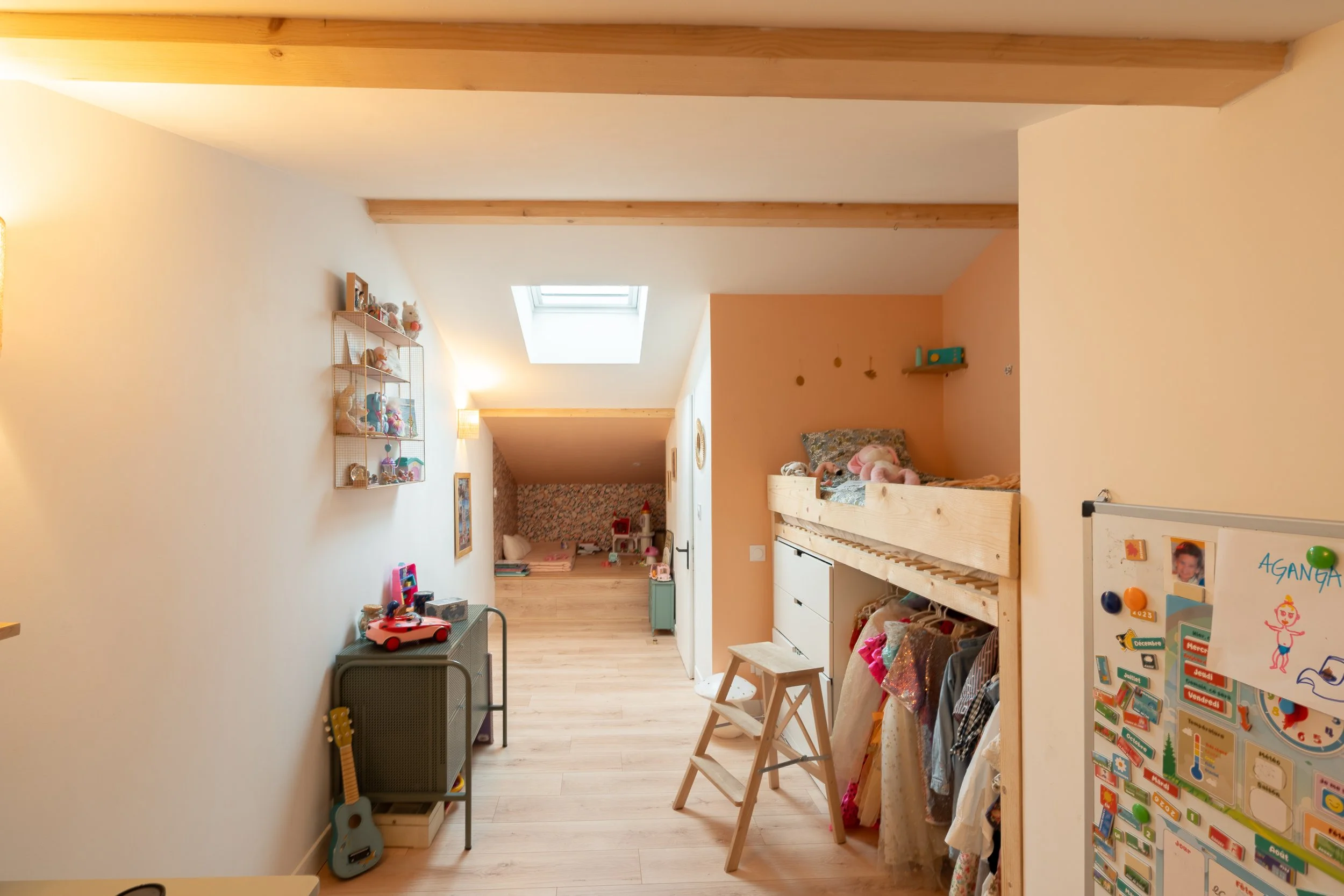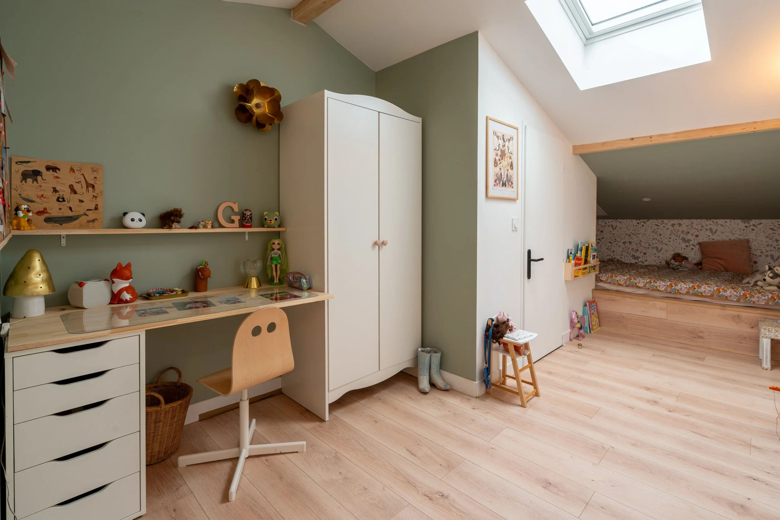 La maison de plain-pied, accueille quatre chambres dont une suite parentale. Comme une balade en forêt, elle offre son lot de surprise et de poésie, il en est ainsi de la petite salle de bain que l’on découvre derrière une porte dissimulée dans le dressing.