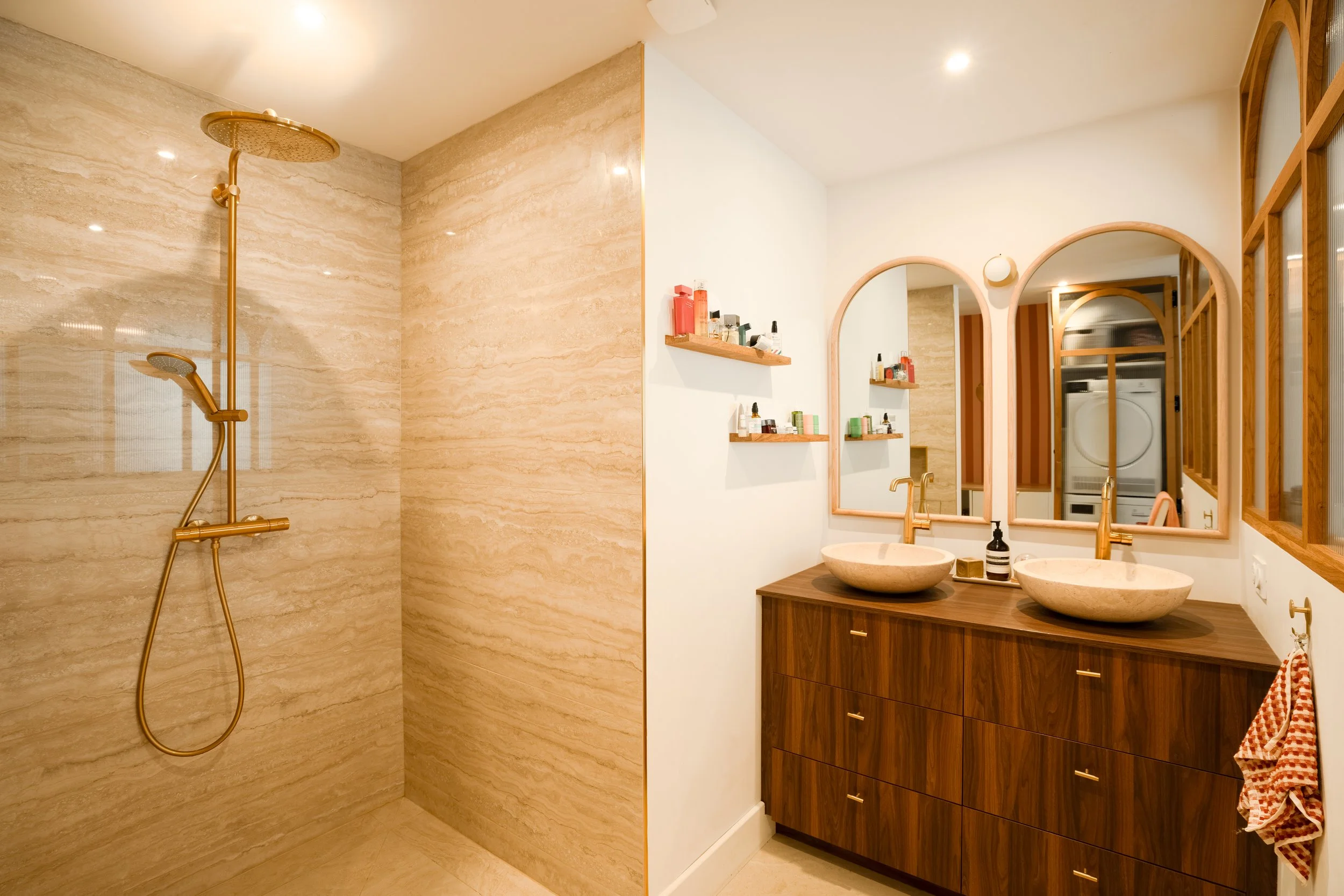 Pour respecter les lieux dans les moindres détails, des poignées en porcelaine, du bois massif, du granit… viennent rappeler qu’ici le temps s’écoule lentement.