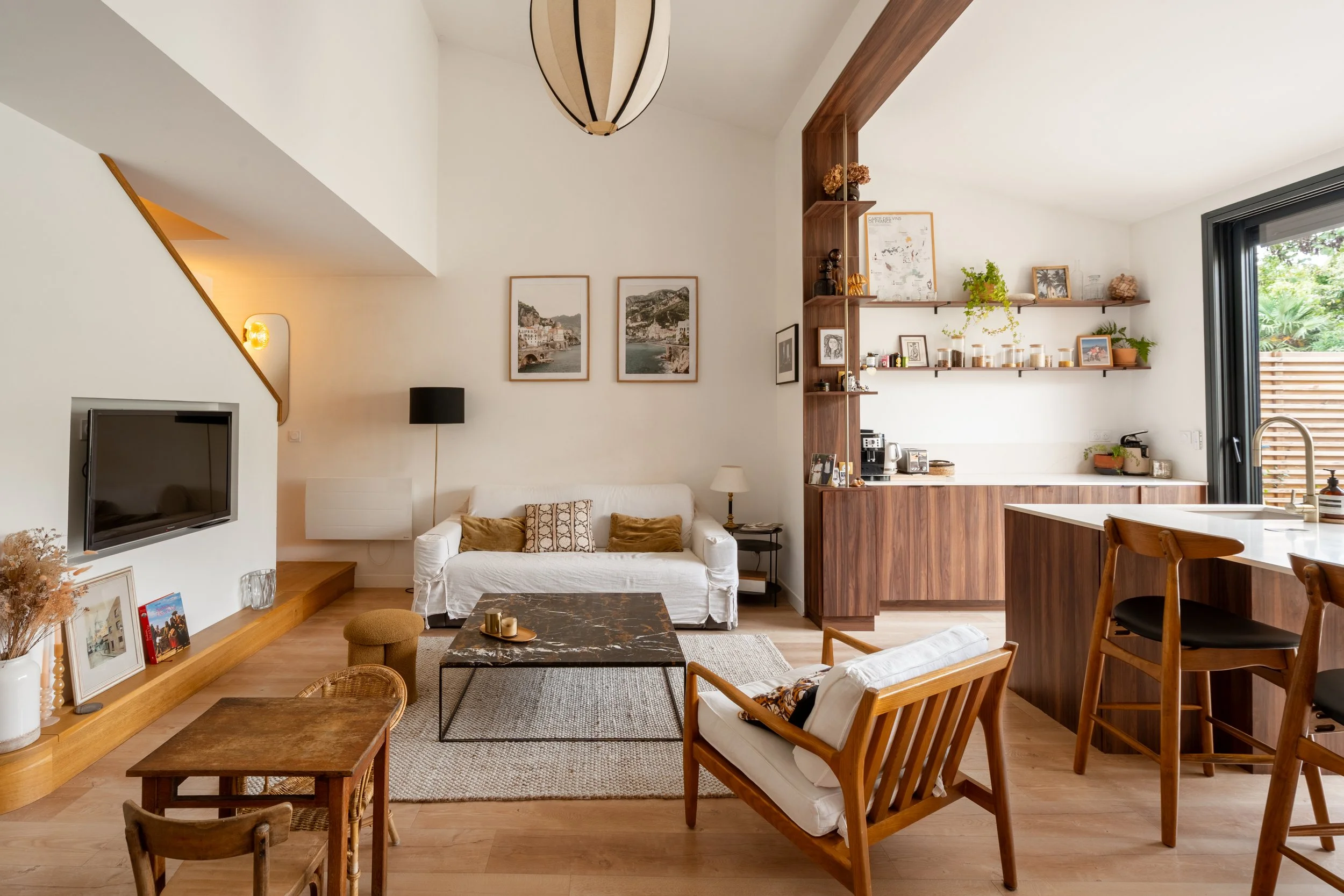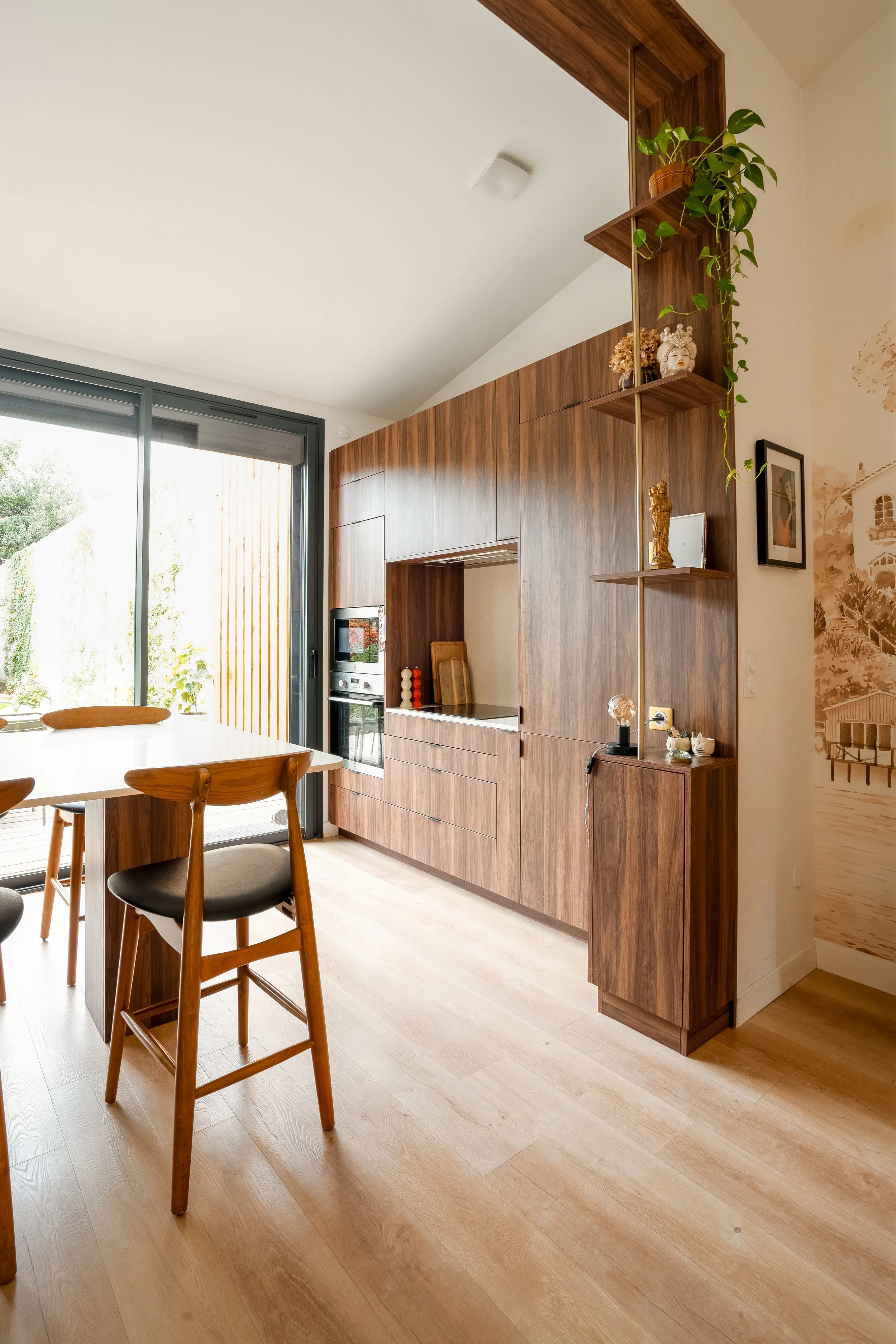 La cuisine de caractère et son îlot massif constituent le cœur battant du foyer. Depuis, une large baie vitrée offre une vue imprenable sur la terrasse et la piscine.