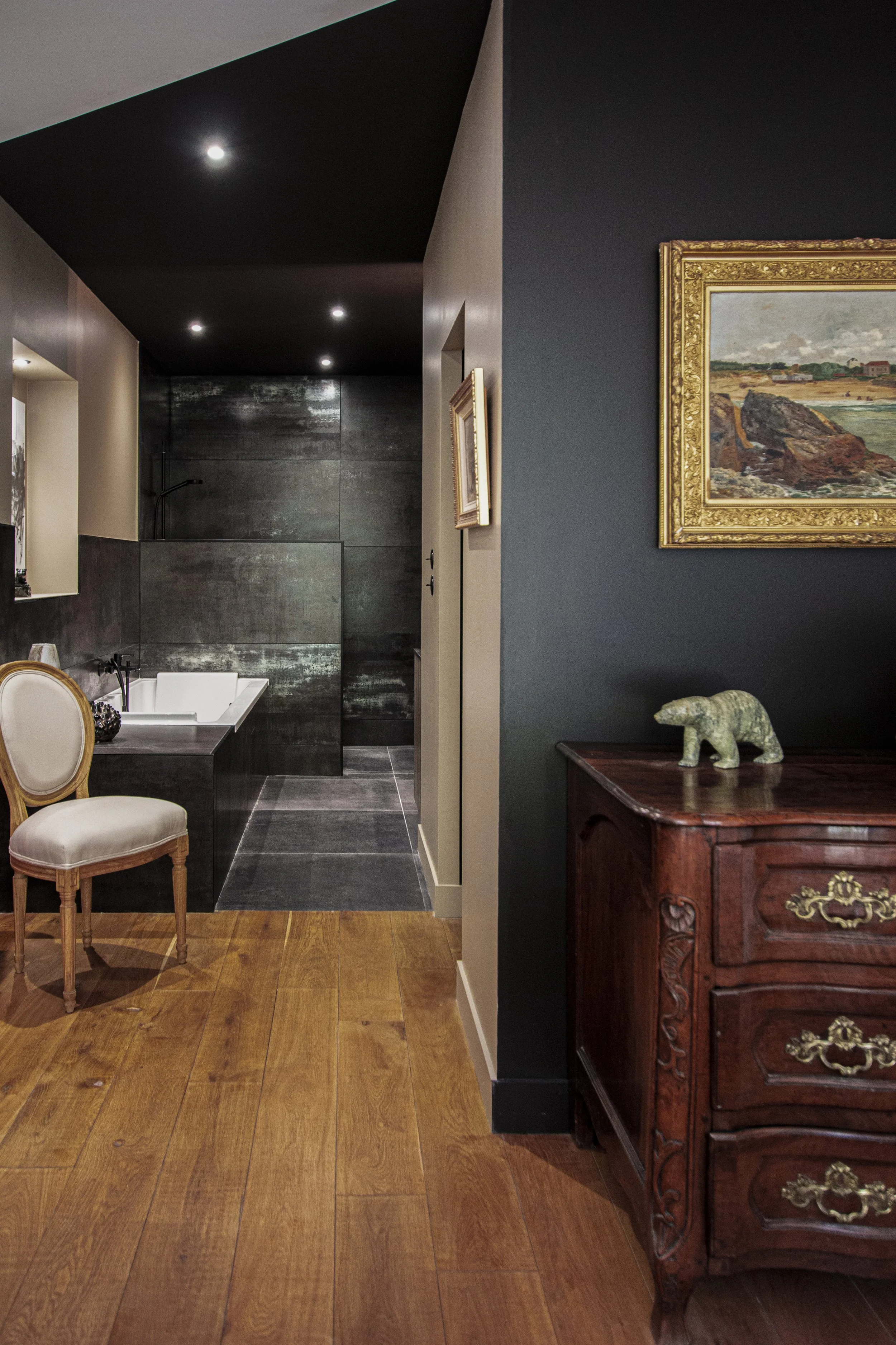 Autre singularité, le travail de « parois » dont les traitements et ouvertures offrent un jeu de transparence en clair voie sur la descente d’escalier d’un côté, une vue d’ensemble en surplomb sur la pièce de vie de l’autre côté.